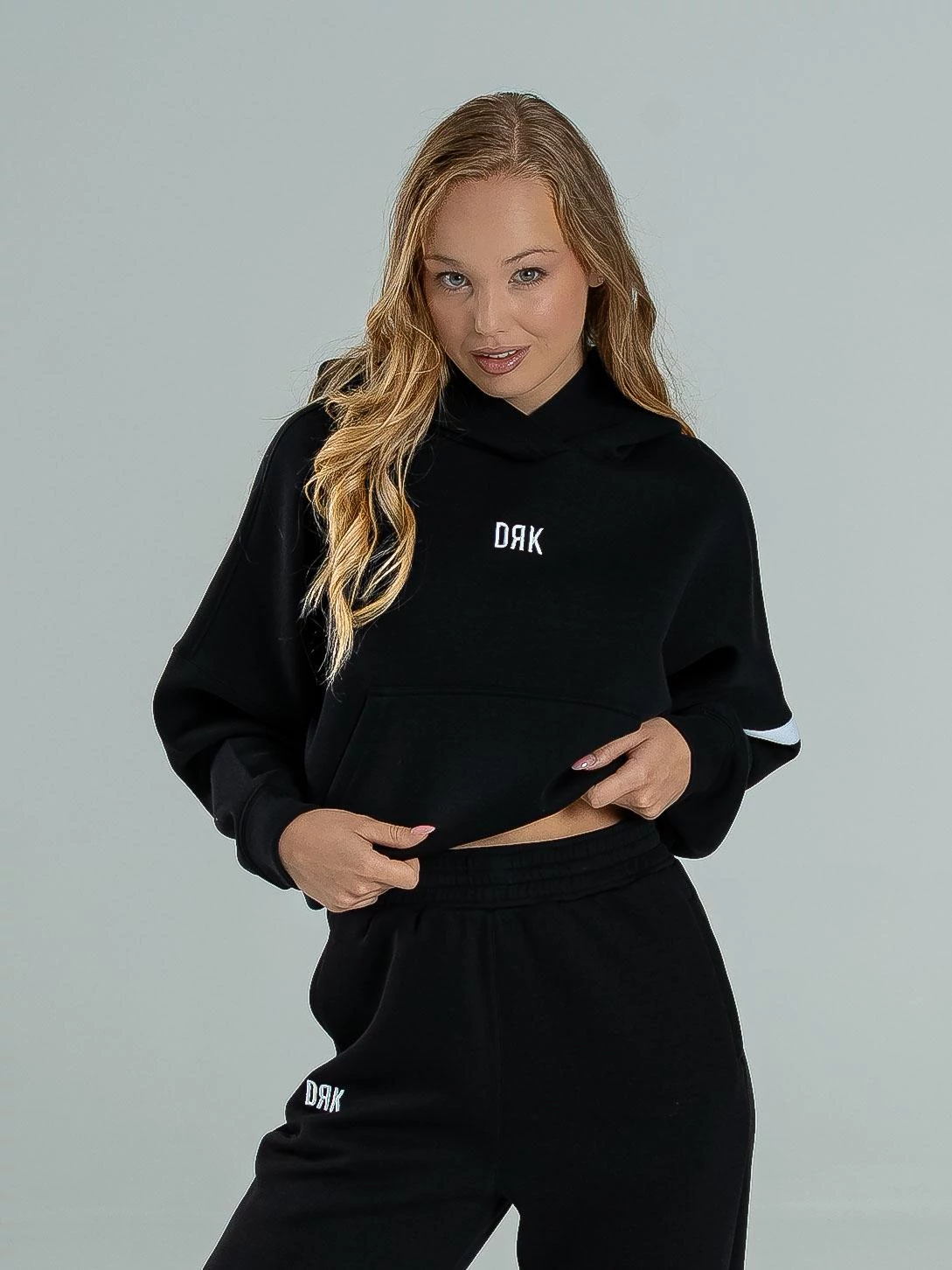 A CLEO oversized, crop fazonú kapucnis pulóver finoman strukturált, kissé vastagabb scuba anyagból készült, amely különösen puha tapintású és kellemes viselet. Bal vállán egy szövött dekorációs szalag fut végig, amely stílusosan harmonizál az elején található kis hímzéssel. Letisztult, mégis karakteres darab a sportos és nőies outfitek kedvelőinek. A modell 174 cm magas és S-es méretet visel.