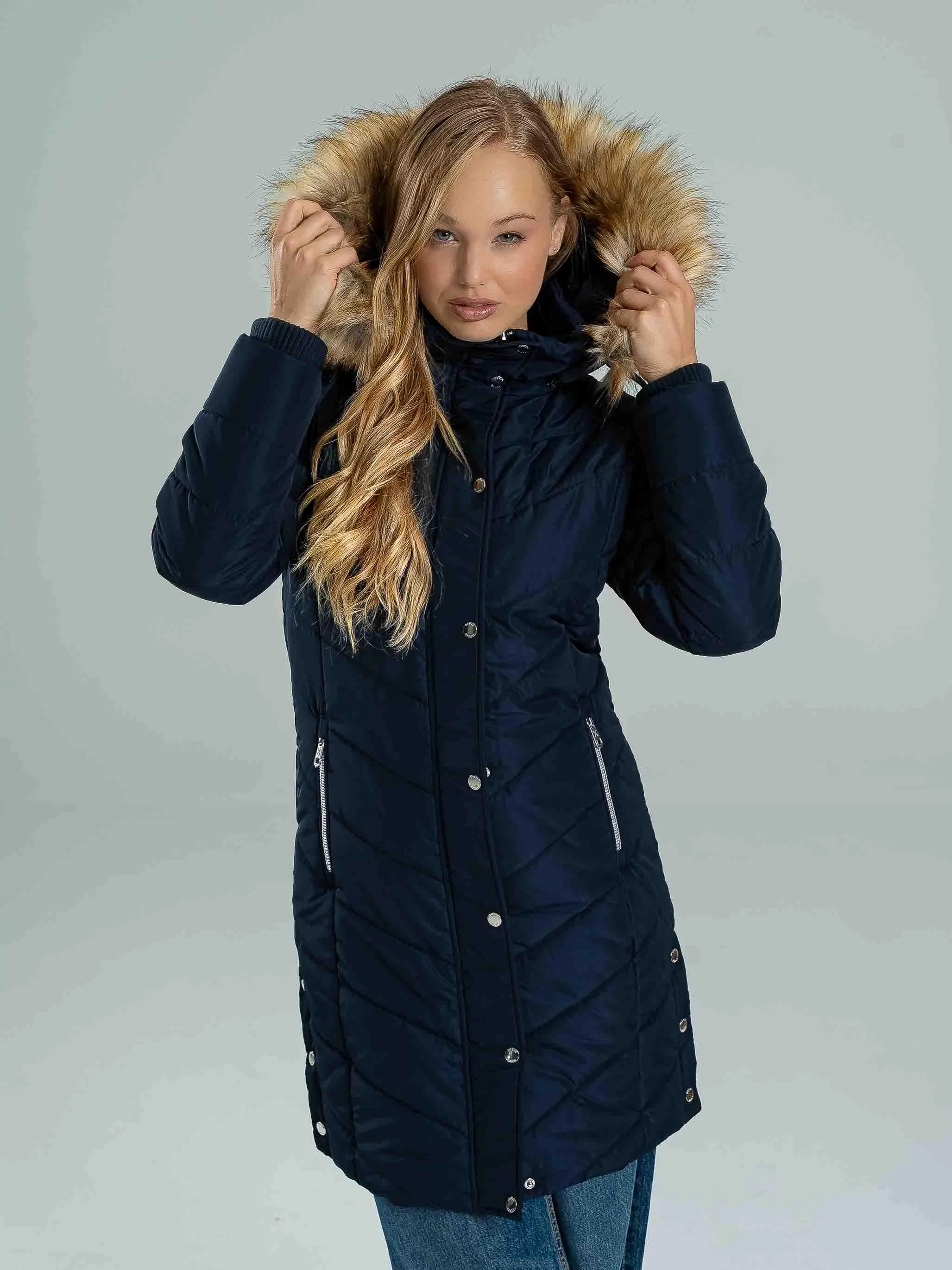 A NENA egy karcsúsított szabású, meleg télikabát, amely tökéletes választás a hideg hónapokra. 100% poliészter anyagból készült, így könnyű, mégis kiválóan szigetel. A fényes guminyomatos logó, a bal felkaron található fémnyomat logó, valamint a logózott gombok és cipzár modern, prémium megjelenést biztosítanak. A levehető szőrmés kapucni variálhatóvá teszi a kabátot, míg a kötött passzé fokozza a komfortérzetet és extra védelmet nyújt a hideg ellen. A modell 174 cm magas és S-es méretet visel.